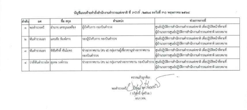 ดังนั้น เพื่อให้การดำเนินการตรวจสอบข้อเท็จจริงในส่วนที่เกี่ยวข้องเป็นไปด้วยความเรียบร้อย มีประสิทธิภาพ มีความโปร่งใส เกิดความเป็นธรรม และมิให้เกิดความเสียหายต่อทางราชการ อาศัยอำนาจตามความในมาตรา 63 และมาตรา 105 แห่งพระราชบัญญัติตำรวจแห่งชาติ พ.ศ. 2565 ประกอบระเบียบสำนักงานตำรวจแห่งชาติ ว่าด้วยการสั่งให้ข้าราชการไปช่วยราชการภายในสำนักงานตำรวจแห่งชาติ พ.ศ. 2566 จึงให้ข้าราชการตำรวจ 4 นาย ดังนี้