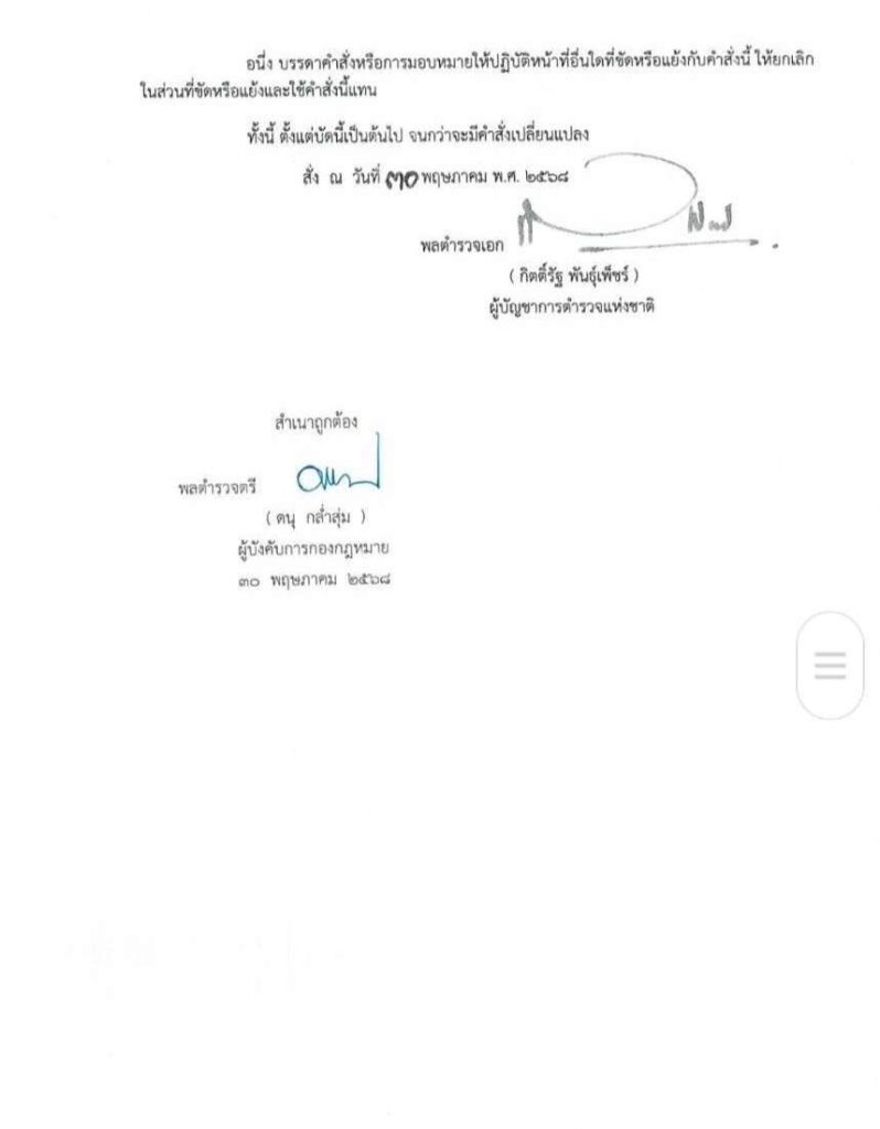 พล.ต.อ.กิตติ์รัฐ พันธุ์เพ็ชร์ ผบ.ตร. ลงนามในคำสั่งสำนักงานตำรวจแห่งชาติ ที่ 308/2568 เรื่องให้ข้าราชการตำรวจช่วยราชการและรักษาราชการแทน ใจความระบุว่า