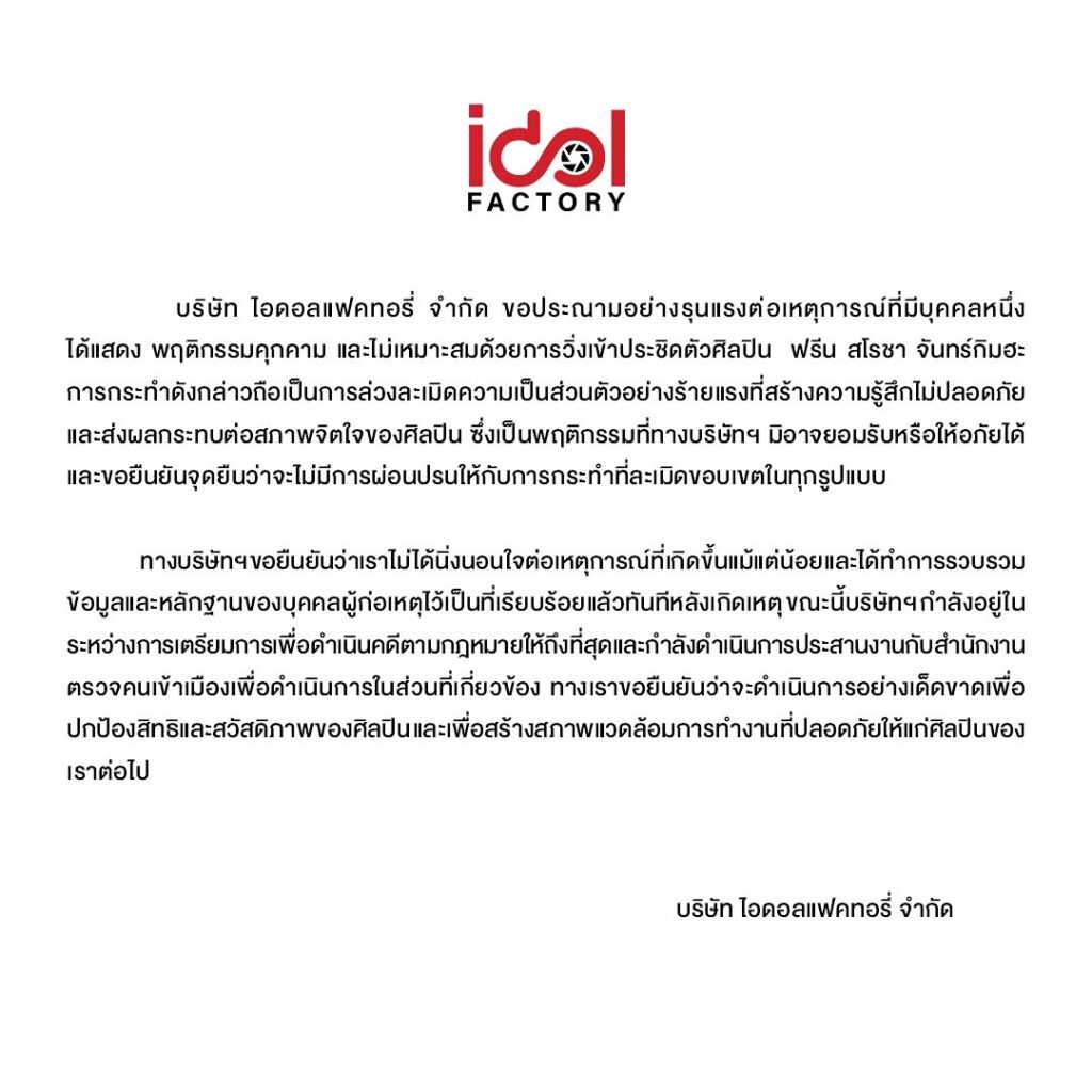 ล่าสุดทางต้นสังกัดอย่าง Idol Factory ไม่รีรอ รีบออกแลงการเกี่ยวกับสิ่งที่เกิดขึ้นที่เป็นการละเมิดความเป็นส่วนตัวขั้นร้ายแรงซึ่งอาจส่งผลกระทบต่อจิตใจของ “ฟรีน” จึงออกมาแสดงจุดยืนโดยแถลงว่า “บริษัท ไอดอลแฟคทอรี่ จำกัด ขอประณามอย่างรุนแรงต่อเหตุการณ์ที่มีบุคคลหนึ่งได้แสดง พฤติกรรมคุกคาม และไม่เหมาะสมด้วยการวิ่งเข้าประชิดตัวศิลปิน ฟรีน สโรชา จันทร์กิมฮะ