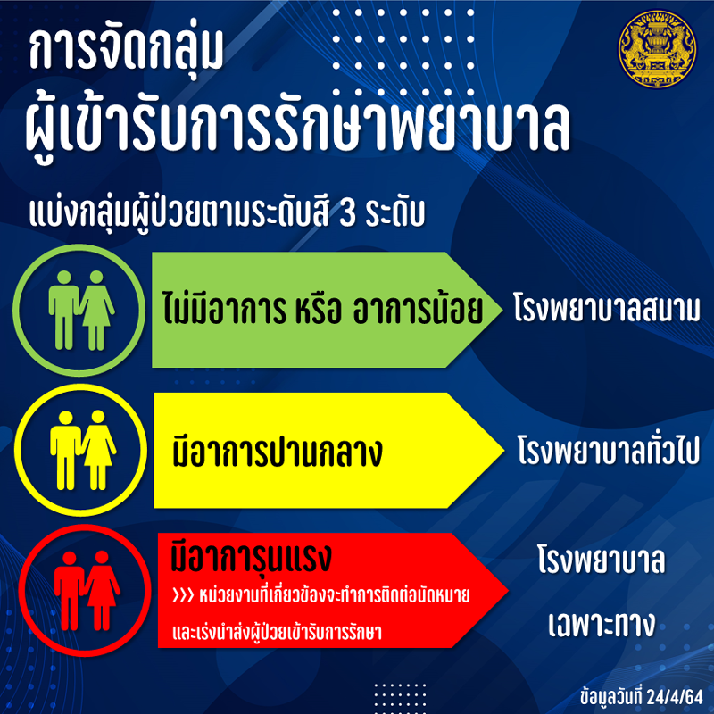 - ระดับสีเขียว (ผู้ป่วยไม่มีอาการหรืออาการน้อย) จัดให้เข้าโรงพยาบาลสนาม