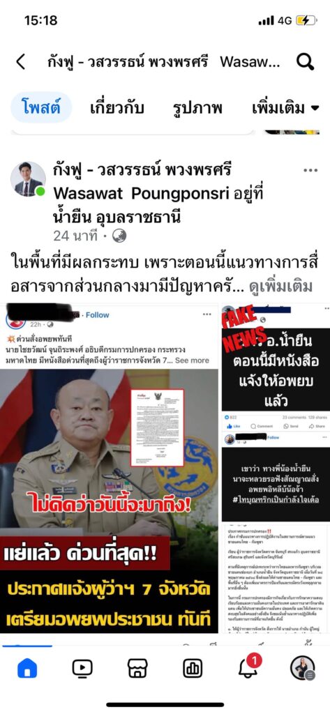 นายวสวรรธน์ พวงพรศรี หัวหน้าพรรคไทรวมพลัง ในฐานะนักการเมืองในพื้นที่ อ.น้ำยืน จ.อุบลราชธานี โพสต์เฟซบุ๊ก ระบุว่า ตอนนี้แนวทางการสื่อสารจากส่วนกลางมามีปัญหาครับ ตั้งแต่หนังสือกรมการปกครองออกมา ทำให้ประชาชนคนแชร์ข้อมูลทางโซเซียลอ่าน 3 บรรทัดทำให้เข้าใจผิด หนังสือบอกว่า “ให้แนวทางเตรียมพร้อมอพยพ ไม่ใช่ต้องอพยพแล้ว” แล้วเกิดความเข้าใจผิด แชร์ข้อมูลต่อนำไปสู่ FAKE NEWS ต่างๆ ข้อมูลเท็จเหล่านี้เกิดผลกระทบซ้ำเติมทางตรงกับพี่น้องประชาชนชาวอำเภอน้ำยืนมากขึ้นไปอีก อันดับแรกด้านจิตใจ การดำรงชีวิตประจำวัน