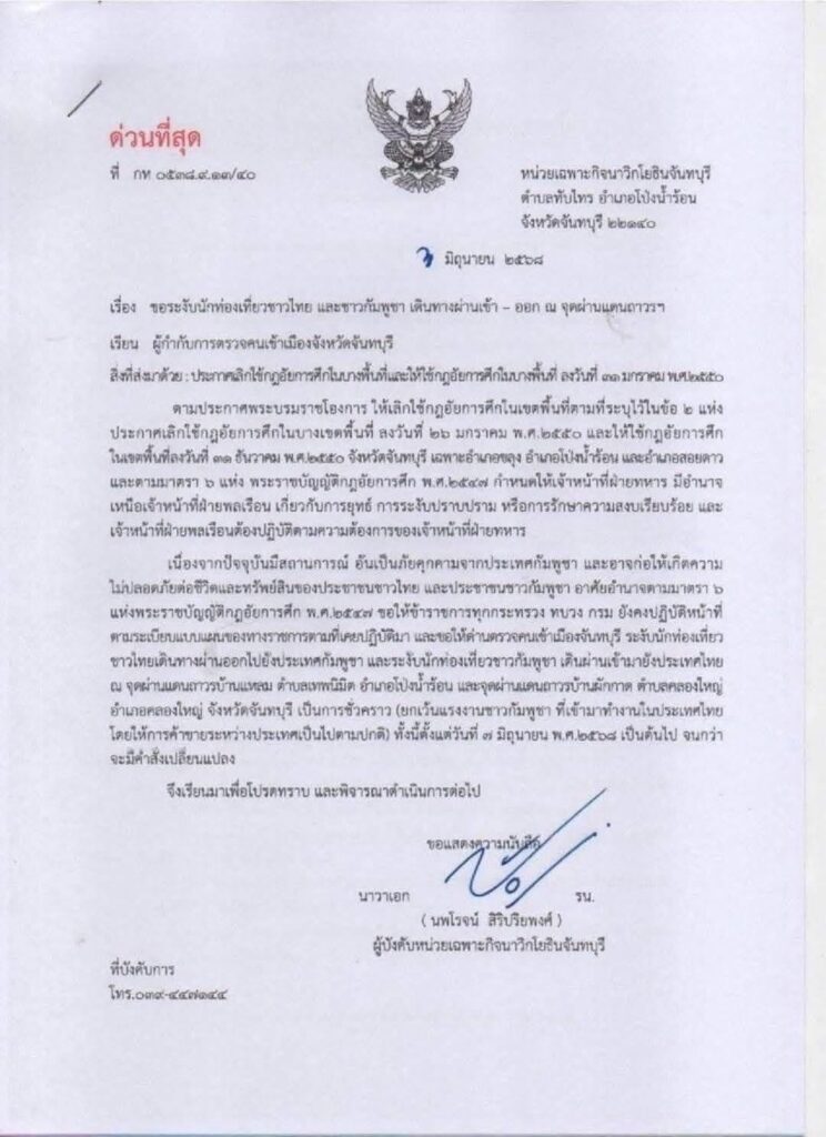 เนื่องจากปัจจุบันมีสถานการณ์ อันเป็นภัยคุกคามจากประเทศกัมพูชา และอาจก่อให้เกิดความ ไม่ปลอดภัยต่อชีวิตและทรัพย์สินของประชาชนชาวไทย และประชาชนชาวกัมพูชา อาศัยอำนาจตามมาตรา 5 แห่งพระราชบัญญัติกฎอัยการศึก 2547 ขอให้ข้าราชการทุกกระทรวง ทบวง กรม ยังคงปฏิบัติหน้าที่ ตามระเบียบแบบแผนของทางราชการตามที่เคยปฏิบัติมา และขอให้ด่านตรวจคนเข้าเมืองจันทบุรี ระงับนักท่องเที่ยวชาวไทยเดินทางผ่านออกไปยังประเทศกัมพูชา และระงับนักท่องเที่ยวชาวกัมพูชา เดินผ่านเข้ามายังประเทศไทย ณ จุดผ่านแดนถาวรบ้านแหลม ตำบลเทพนิมิต อำเภอโป่งน้ำร้อน และจุดผ่านแดนถาวรบ้านผักกาด ตำบลคลองใหญ่ อำเภอคลองใหญ่ จังหวัดจันทบุรี เป็นการชั่วคราว (ยกเว้นแรงงานชาวกัมพูชา ที่เข้ามาทำงานในประเทศไทย โดยให้การค้าขายระหว่างประเทศเป็นไปตามปกติ) ทั้งนี้ตั้งแต่วันที่ 7 มิถุนายน 2568 เป็นต้นไป จนกว่า จะมีคำสั่งเปลี่ยนแปลง