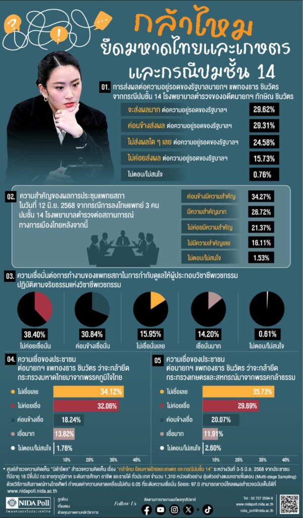 ศูนย์สำรวจความคิดเห็น “นิด้าโพล” สถาบันบัณฑิตพัฒนบริหารศาสตร์ (นิด้า) เปิดเผยผลการสำรวจเรื่อง “กล้าไหม ยึดมหาดไทยและเกษตร และกรณีปมชั้น 14” โดยทำการสำรวจระหว่างวันที่ 3-5 มิถุนายน 2568 จากประชาชนที่มีอายุ 18 ปีขึ้นไป กระจายทุกภูมิภาค ระดับการศึกษา อาชีพ และรายได้ ทั่วประเทศ รวมจำนวนทั้งสิ้น 1,310 หน่วยตัวอย่าง เกี่ยวกับความเชื่อมั่นของประชาชนต่อกรณีปมชั้น 14 โรงพยาบาลตำรวจ ของอดีตนายกรัฐมนตรีทักษิณ ชินวัตร พบว่า เมื่อถามถึงการส่งผลต่อความอยู่รอดของรัฐบาลนายกรัฐมนตรีแพทองธาร ชินวัตร จากกรณีปมชั้น 14 โรงพยาบาลตำรวจของอดีตนายกรัฐมนตรีทักษิณ ชินวัตร พบว่า ตัวอย่าง ร้อยละ 29.62 ระบุว่า จะส่งผลมาก ต่อความอยู่รอดของรัฐบาลฯ รองลงมา ร้อยละ 29.31 ระบุว่า ค่อนข้างส่งผล ต่อความอยู่รอดของรัฐบาลฯ ร้อยละ 24.58 ระบุว่า ไม่ส่งผลใด ๆ เลย ต่อความอยู่รอดของรัฐบาลฯ และร้อยละ 15.73 ระบุว่า ไม่ค่อยส่งผล ต่อความอยู่รอดของรัฐบาลฯ