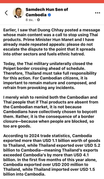 โพสต์เดือดโต้ปิดด่าน! “ฮุน เซน” หยุดใช้สินค้าไทยไม่ใช่เพราะกัมพูชา