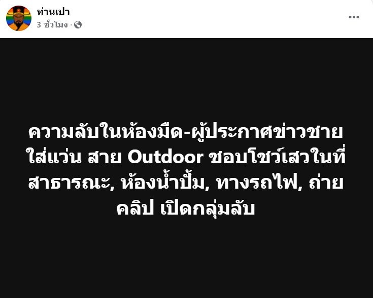 ทำเอาสะเทือนวงการผู้ประกาศข่าว เมื่อเพจดังอย่าง “ท่านเปา” ได้ทำการโพสต์ที่ชวนชาวเน็ตใส่ใจ เป็นเรื่องของผู้ประกาศข่าวที่ชอบโชว์ของลับในที่สาธารณะ  โดย โพสต์ว่า “ความลับในห้องมืด-ผู้ประกาศข่าวชายใส่แว่น สาย Outdoor ชอบโชว์เสวในที่สาธารณะ, ห้องน้ำปั้ม, ทางรถไฟ, ถ่ายคลิป เปิดกลุ่มลับ” และยังใบ้เพิ่มเติมด้วยว่า “ใส่แว่น ไม่ใช่นักข่าวภาคสนาม คนนี้นั่งอ่านในสตู”   ทั้งยังแนบภาพหลักฐานเห็นขาแบบชัด ๆ ด้วย