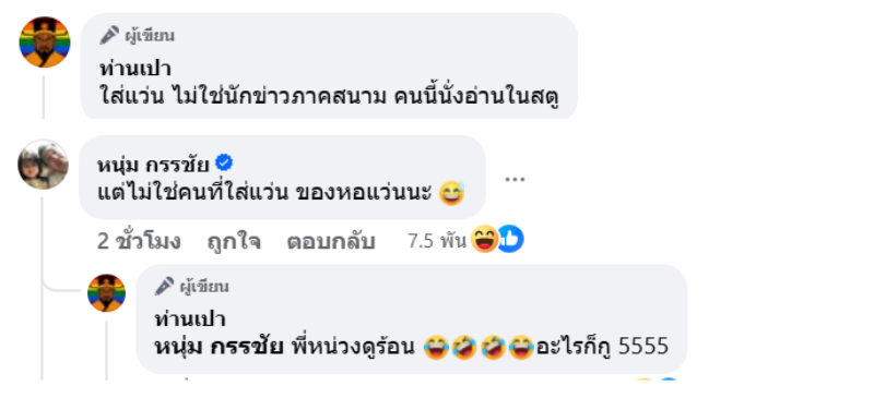 ไม่นานผู้ประกาศข่าวชื่อดัง “หนุ่ม กรรชัย” ก็ได้เข้ามาคอมเมนต์ปฏิเสธทันทีว่า “แต่ไม่ใช่คนที่ใส่แว่น ของหอแว่นนะ  ” ซึ่งทาง “ท่านเปา” ก็ได้มาตอบกลับว่า “พี่หน่วงดูร้อน  อะไรก็กู 5555” งานนี้ชาวเน็ตต่างแห่มุงคาดเดากันว่าผู้ประกาศที่เอ่ยถึงนั้นคือใน ที่ แน่ ๆ ไม่ใช่ “หนุ่ม กรรชัย” อย่างแน่นอน