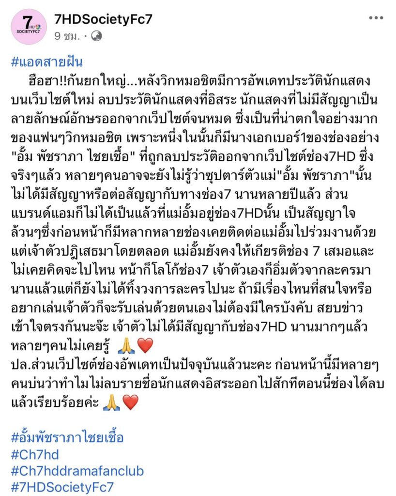 ล่าสุดทางด้าน เพจ” 7HDSocietyFc7“ ได้ออกมาชี้แจงถึงประเด็นดังกล่าวว่า ”ฮือฮา!!กันยกใหญ่…หลังวิกหมอชิตมีการอัพเดทประวัตินักแสดงบนเว็บไซต์ใหม่ ลบประวัตินักแสดงที่อิสระ นักแสดงที่ไม่มีสัญญาเป็นลายลักษณ์อักษรออกจากเว็ปไซต์จนหมด ซึ่งเป็นที่น่าตกใจอย่างมากของแฟนๆวิกหมอชิต เพราะหนึ่งในนั้นก็มีนางเอกเบอร์1ของช่องอย่าง “อั้ม พัชราภา ไชยเชื้อ” ที่ถูกลบประวัติออกจากเว็ปไชต์ช่อง7HD ซึ่งจริงๆแล้ว หลายๆคนอาจจะยังไม่รู้ว่าซุปตาร์ตัวแม่”อั้ม พัชราภา” นั้นไม่ได้มีสัญญาหรือต่อสัญญากับทางช่อง7 นานหลายปีแล้ว ส่วนแบรนด์แอมก็ไม่ได้เป็นแล้วที่แม่อั้มอยู่ช่อง7HDนั้น เป็นสัญญาใจล้วนๆซึ่งก่อนหน้าก็มีหลากหลายช่องเคยติดต่อแม่อั้มไปร่วมงานด้วย แต่เจ้าตัวปฎิเสธมาโดยตลอด แม่อั้มยังคงให้เกียรติช่อง 7 เสมอและไม่เคยคิดจะไปไหน หน้าก็โลโก้ช่อง7 เจ้าตัวเองก็อิ่มตัวจากละครมานานแล้วแต่ก็ยังไม่ได้ทิ้งวงการละครไปนะ ถ้ามีเรื่องไหนที่สนใจหรืออยากเล่นเจ้าตัวก็จะรับเล่นด้วยตนเองไม่ต้องมีใครบังคับ สยบข่าว เข้าใจตรงกันนะจ๊ะ เจ้าตัวไม่ได้มีสัญญากับช่อง7HD นานมากๆแล้วหลายๆคนไม่เคยรู้ 🙏❤️ ปล.ส่วนเว็ปไซต์ช่องอัพเดทเป็นปัจจุบันแล้วนะคะ ก่อนหน้านี้มีหลายๆคนบ่นว่าทำไมไม่ลบรายชื่อนักแสดงอิสระออกไปสักทีตอนนี้ช่องได้ลบแล้วเรียบร้อยค่ะ 🙏❤️“