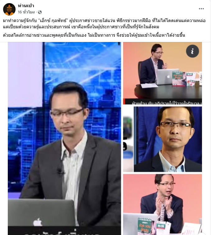 ล่าสุดเพจ “ท่านเปา” ได้โพสต์ในกลุ่ม “อีซ้อ : ขยี้ข่าวอีซ้อ” ถึงผู้ประกาศข่าวชายคนหนึ่งว่า “มาทำความรู้จักกับ “เอ็กซ์ กุลพัทธ์” ผู้ประกาศข่าวชายใส่แว่น พิธีกรข่าวมากฝีมือ ที่ไม่ได้โดดเด่นแค่ความหล่อ แต่เปี่ยมด้วยความรู้และประสบการณ์ เขาคือหนึ่งในผู้ประกาศข่าวที่เป็นที่รู้จักในสังคม ด้วยสไตล์การอ่านข่าวและพูดคุยที่เป็นกันเอง ไม่เป็นทางการ จึงช่วยให้ผู้ชมเข้าใจเนื้อหาได้ง่ายขึ้น”