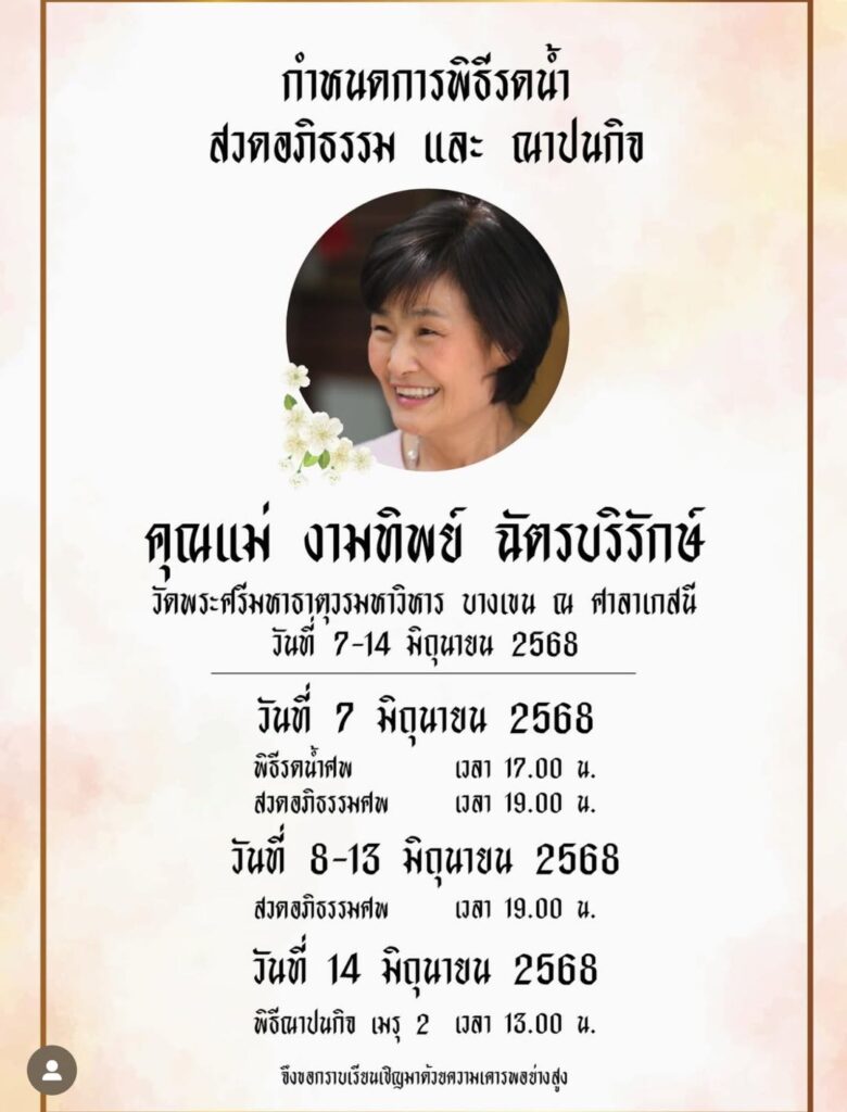 เรียกว่าคนบันเทิง ยังคงเดินทางไปร่วมไว้อาลัยครั้งสุดท้ายการจากไปของ “คุณแม่งามทิพย์ ฉัตรบริรักษ์” คุนแม่ของนักแสดงหนุ่ม “บอย ปกรณ์” อย่างต่อเนื่อง และต่างส่งกำลังใจให้ ซึ่งบรรยากาศสวดอภิธรรม เต็มไปด้วยความโศกเศร้า และเปี่ยมไปด้วยความอาลัยของญาติมิตรสนิท ทั้งในวงการบันเทิง และนอกวงการ