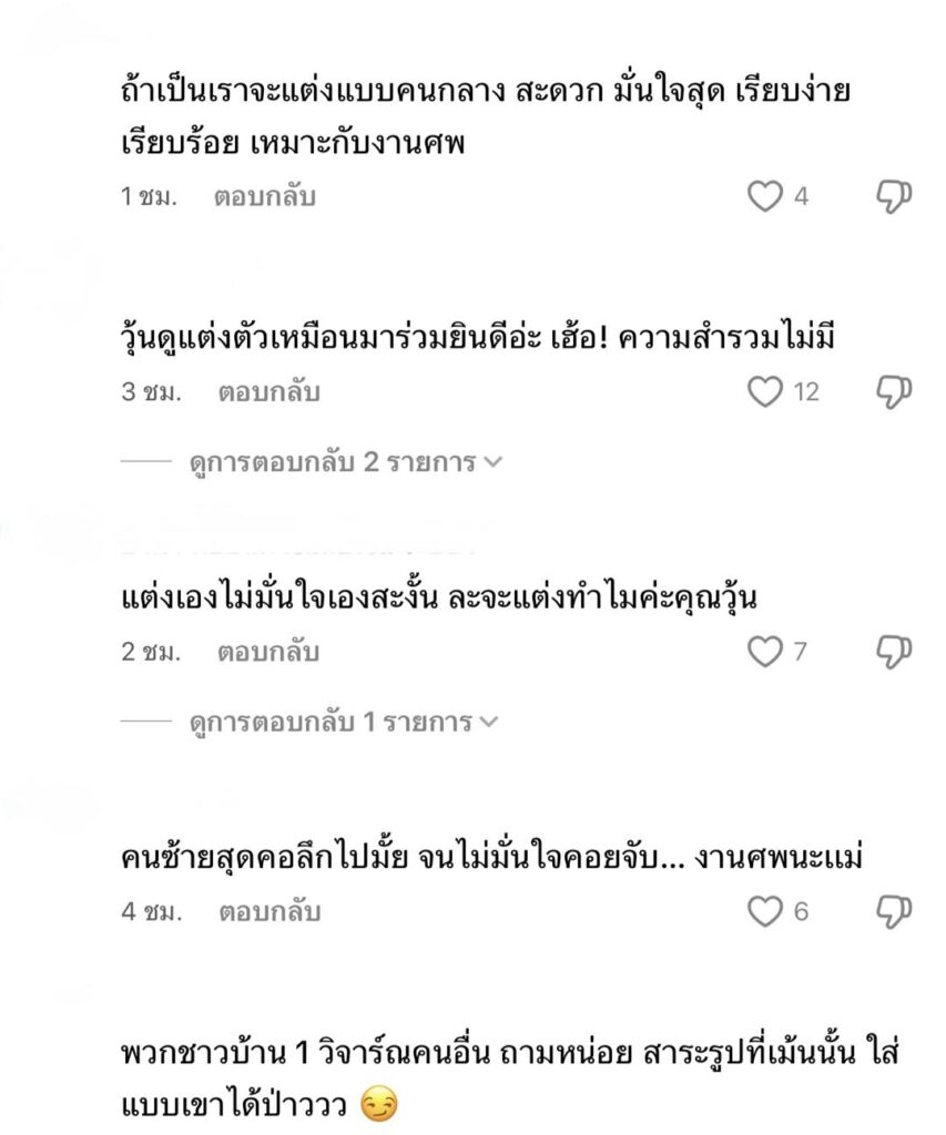 เช่นเดียวกับ3นักแสดง “คริส หอวัง – เจนสุดา และ วุ้นเส้น วิริฒิพา” ที่ได้เดินทางมาร่วมไว้อาลัย “คุณแม่งามทิพย์” เช่นกัน แต่ไม่วายแอบเจอดราม่าเนื่องจากชาวเน็ตเข้ามาคอมเมนต์ตำหนิการแต่งตัวของสาว “วุ้นเส้น” ที่ชุดไม่ให้เกียรติงานและสถานที่ ซึ่งสาว “วุ้นเส้น” มาในชุดเดรส คอแอบลึก ใส่ถุงน่องสีดำ โดยชาวเน็ตเข้ามาคอมเมนต์ว่า “วุ้นเส้นไม่มีชุดที่เหมาะกับงานแล้วรึ ,ดูกระโปรงสั้นไปและเสื้อคอลึกเกินไป..เลยดูไม่ค่อยเหมาะค่ะเพราะสังเกตุดูคนอื่นๆในงานเค้าก็ใส่แบบเรียบร้อยมิดชิดกว่าวุ้นเส้นไง ,วุ้นดูแต่งตัวเหมือนมาร่วมยินดีอ่ะ เฮ้อ! ความสำรวมไม่มี , ชุดเว้าลึกไป รองเท้าจะส้นสูงอะไรขนาดนั้น” แต่ก็มีบางคนเข้ามาปกป้องว่า “พวกชาวบ้าน 1 วิจาร์ณคนอื่น ถามหน่อย สาระรูปที่เม้นนั้น ใส่แบบเขาได้ป่าววว , ชุดวุ้นเส้นก้อไม่น่าเกลียดขนาดนั้นใส่ถุงน่องแล้วดูสุภาพ”