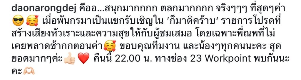 “คืออ…สนุกมากกกก ตลกมากกกก จริงๆๆๆ ที่สุดๆค่า เมื่อพันกรมาเป็นแขกรับเชิญใน ’ก็มาดิคร้าบ‘ รายการโปรดที่สร้างเสียงหัวเราะและความสุขให้กับผู้ชมเสมอ โดยเฉพาะพี่ณพที่ไม่เคยพลาดซ้ากกตอนค่า ขอบคุณทีมงาน และน้องๆทุกคนนะคะ สุดยอดมากๆค่ะ”