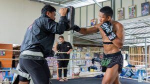 “แสงอาทิตย์ ลูกทรายกองดิน” นักชกหนุ่มวัย 21 ปี ดีกรีแชมป์มวยสากล เปิดประตูค่าย “ลูกทรายกองดิน” ของครอบครัวตระกูลมวย ต้อนรับกองทัพสื่อมวลชนที่มาร่วมกิจกรรมเช็กฟิตนักกีฬา (Open Workout) ก่อนที่เขาจะขึ้นชกในกติกาคิกบ็อกซิ่งเป็นครั้งที่ 2 บนเวที ONE ลุมพินี โดยจะปะทะกับ “เสือแบล็ค ท.พราน 49” มวยกะเหรี่ยงพันธุ์เดือด ในศึกนัดใหญ่ ONE ลุมพินี 114 ที่จะเปิดฉากขึ้นในวันศุกร์ที่ 27 มิ.ย.นี้