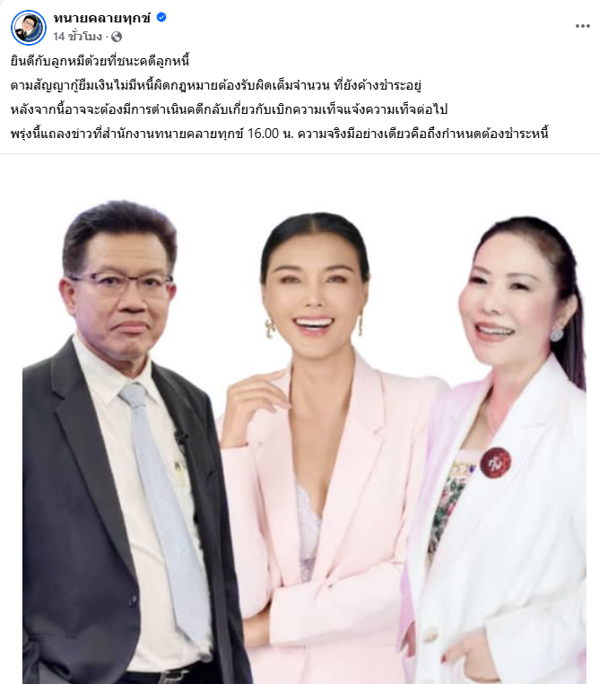 ขณะเดียวกันทางด้าน “ทนายเดชา” ได้โพสต์ผ่านเพจทนายคลายทุกข์ว่า “ยินดีกับลูกหมีด้วยที่ชนะคดีลูกหนี้ ตามสัญญากู้ยืมเงินไม่มีหนี้ผิดกฎหมายต้องรับผิดเต็มจำนวน ที่ยังค้างชำระอยู่ หลังจากนี้อาจจะต้องมีการดำเนินคดีกลับเกี่ยวกับเบิกความเท็จแจ้งความเท็จต่อไป พรุ่งนี้แถลงข่าวที่สำนักงานทนายคลายทุกข์ 16.00 น. ความจริงมีอย่างเดียวคือถึงกำหนดต้องชำระหนี้” ซึ่งทางด้าน “ลูกหมี” ได้ออกมาเลื่อนการแถลงข่าวเป็นเวลา 14.00น. แทน