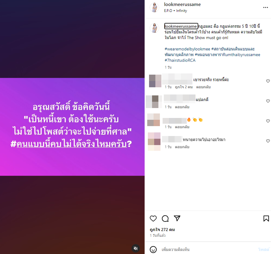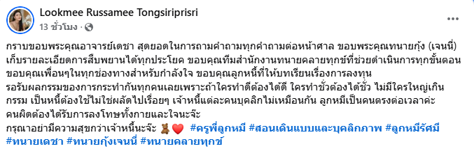 และโพสต์ข้อความอีกว่า “กราบขอบพระคุณอาจารย์เดชา สุดยอดในการถามคำถามทุกคำถามต่อหน้าศาล ขอบพระคุณทนายกุ้ง (เจนนี่) เก็บรายละเอียดการสืบพยานได้ทุกประโยค ขอบคุณทีมสำนักงานทนายคลายทุกข์ที่ช่วยดำเนินการทุกขั้นตอน ขอบคุณเพื่อนๆในทุกช่องทางสำหรับกำลังใจ ขอบคุณลูกหนี้ที่ให้บทเรียนเรื่องการลงทุน รอรับผลกรรมของการกระทำกันทุกคนเลยเพราะถ้าใครทำดีต้องได้ดี ใครทำชั่วต้องได้ชั่ว ไม่มีใครใหญ่เกินกรรม เป็นหนี้ต้องใช้ไม่ใช่ผลัดไปเรื่อยๆ เจ้าหนี้แต่ละคนบุคลิกไม่เหมือนกัน ลูกหมีเป็นคนตรงต่อเวลาค่ะ คนผิดต้องได้รับการลงโทษทั้งกายและใจนะจ๊ะ กรุณาอย่ามีความสุขกว่าเจ้าหนี้นะจ๊ะ #ครูพี่ลูกหมี #สอนเดินแบบและบุคลิกภาพ #ลูกหมีรัศมี #ทนายเดชา #ทนายกุ้งเจนนี่ #ทนายคลายทุกข์”