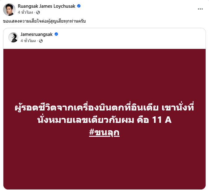 ขนลุก! “เจมส์ เรืองศักดิ์” เผยผู้รอดชีวิตเหตุเครื่องบินตกอินเดีย นั่งเลขเดียวกันเป๊ะ พร้อมแสดงความเสียใจ ชาวเน็ตคอมเมนต์สนั่น