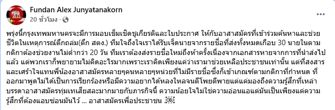 ล่าสุด “เล็ก” ได้โพสต์รูปภาพพร้อมข้อความตัดพ้อเบา ๆ ว่า “พรุ่งนี้กรุงเทพมหานครจะมีการมอบเข็มเชิดชูเกียรติและใบประกาศ ให้กับอาสาสมัครที่เข้าร่วมค้นหาและช่วยชีวิตในเหตุการณ์ตึกถล่ม(ตึก สตง.) ทีมใจถึงใจเราได้รับเจ็ดนายจากรายชื่อที่ส่งทั้งหมดเกือบ 30 นายในตามกติกาต้องช่วยงานไม่ต่ำกว่า 20 วัน ทีมเราต้องส่งรายชื่อใหม่ถึงห้าครั้งเนื่องจากเอกสารหายจากการที่นำส่งไปแล้ว แต่พวกเราก็พยายามไม่คิดอะไรมากเพราะเราคิดเพียงแค่ว่าเรามาช่วยเหลือประชาชนเท่านั้น