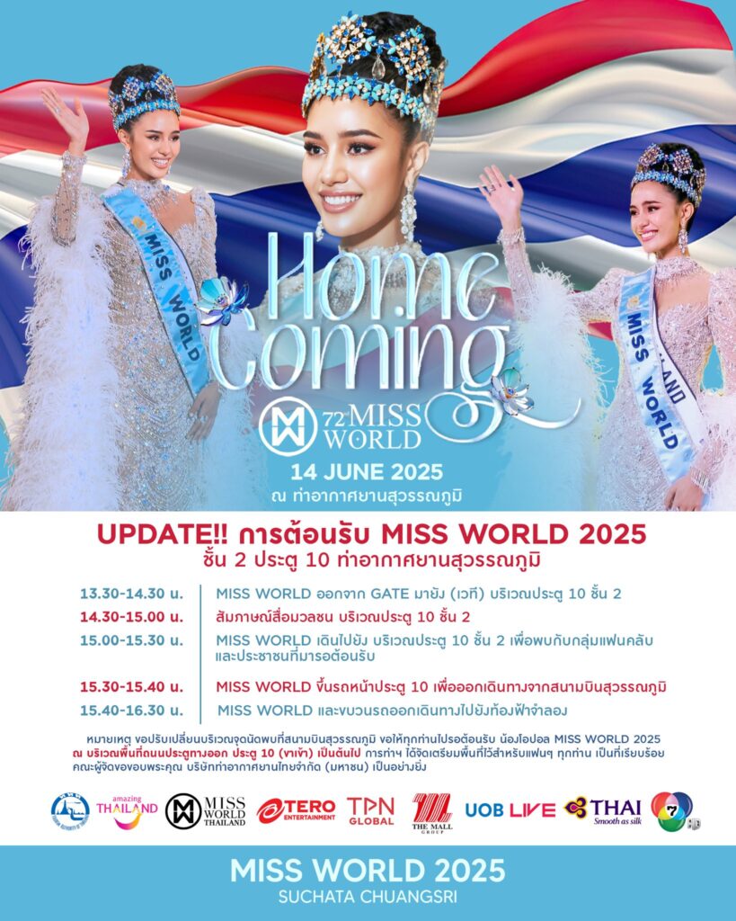 นับเป็นประวัติศาสตร์ครั้งยิ่งใหญ่ของประเทศไทยที่มี “โอปอล สุชาตา” เป็นผู้ครองมงกุฎ Miss World 2025 ตั้งแต่วินาทีที่ประกาศผลก็สร้างความดีใจให้กับคนไทยทั้งประเทศ ซึ่งวันนี้เป็นกำหนดการณ์ที่ “โอปอล” ได้เดินทางกลับประเทศไทย ทำให้ช่วงเช้าที่ผ่านมาจนถึงตอนนี้ที่สนามบินสุวรรณภูมิมีผู้คนไปต้อนรับและพร้อมใจกันแสดงความยินดีให้เธออย่างล้นหลาม