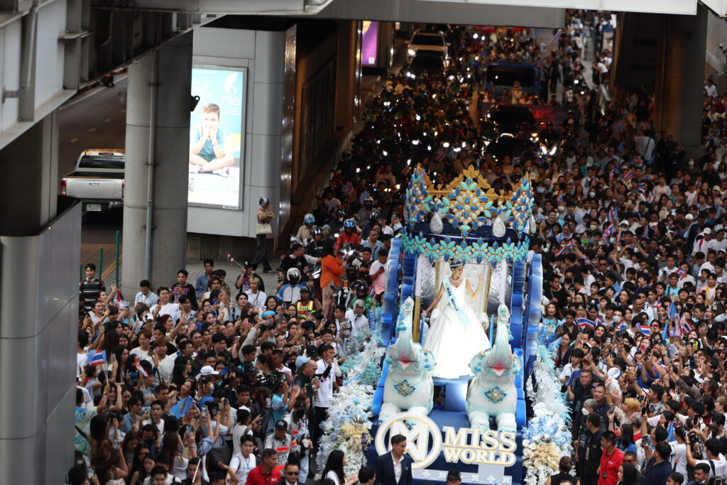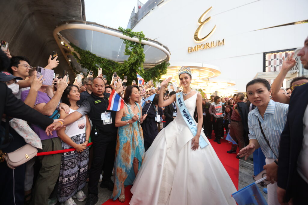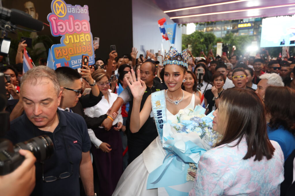 วันนี้เป็นวาระแห่งชาติที่คนไทยพร้อมใจกันมารอต้อนรับ “โอปอล-สุชาตา ช่วงศรี” มิสเวิลด์คนแรกของไทยกันอย่างเนืองแน่นตั้งแต่สนามบินสุวรรณภูมิ เพื่อร่วมฉลองความสุขแห่งเกียรติยศนี้ด้วยกัน โดยหลังจากเสร็จสิ้นพิธีการต่างๆ ที่สนามบินสุวรรณภูมิแล้ว “โอปอล-สุชาตา” ร่วมด้วย “จูเลีย มอร์ลีย์ CBE” ประธานและซีอีโอ องค์กรมิสเวิลด์, “มร.ไบรอัน แอล มาร์การ์” กรรมการผู้จัดการบริษัทเทโรเอ็นเทอร์เทนเม้นท์ฯ และ “ปิยาภรณ์ แสนโกศิก” ประธานกรรมการบริหารบริษัททีพีเอ็นโกลบอลฯ ได้มาร่วมขบวนพาเหรดสุดยิ่งใหญ่ ที่จัดขึ้นเพื่อให้ประชาชนคนไทยได้ร่วมเฉลิมฉลองมงฟ้ามงแรก และแสดงความยินดีกับมิสเวิลด์คนแรกของไทยแบบใกล้ชิดบนถนนสุขุมวิท เริ่มตั้งแต่ท้องฟ้าจำลอง ผ่านห้างสรรพสินค้าเอ็มโพเรียม, สวนเบญจกิติ ไปลงรถที่ EM DISTRICK ก่อนจะเดินพรมแดงขึ้นไปที่ UOB LIVE เพื่อร่วมพิธีต้อนรับ Miss World 2025 อย่างเป็นทางการอีกครั้ง