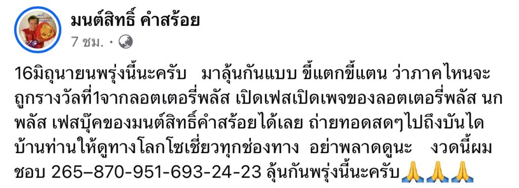 ปิดท้ายกันที่เจ้าพ่อไบ้เลขเด็ด “มนต์สิทธิ์ คำสร้อย“ ต้องบอกว่าคนนี้ เขาไม่เคยพลาดสักงวด โดยงวดนี้เจ้าตัวออกมาโพสต์ข้อความว่า “16 มิถุนายนพรุ่งนี้นะครับ มาลุ้นกันแบบ ขี้แตกขี้แตน ว่าภาคไหนจะถูกรางวัลที่1จากลอตเตอรี่พลัส เปิดเฟสเปิดเพจของลอตเตอรี่พลัส นกพลัส เฟสบุ๊คของมนต์สิทธิ์คำสร้อยได้เลย ถ่ายทอดสดๆไปถึงบันไดบ้านท่านให้ดูทางโลกโซเชี่ยวทุกช่องทาง อย่าพลาดดูนะ งวดนี้ผมชอบ 265- 870-951-693-24-23 ลุ้นกันพรุ่งนี้นะครับ”
