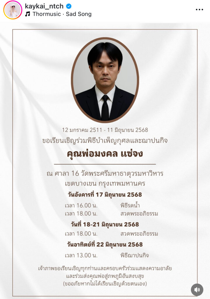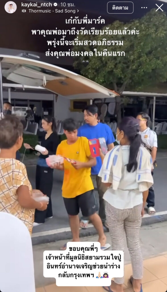 ขณะเดียวกันทางด้าน “เก๋ไก๋” ก็ได้ออกมาโพสต์สตอรี่ รับร่างคุณพ่อ ถึงที่วัดพระศรีฯแล้ว พร้อมเขียนข้อความว่า”เก๋กับพี่มาร์คพาคุณพ่อมาถึงวัดเรียบร้อยแล้วค่ะ พรุ่งนี้จะเริ่มสวดอภิธรรมส่งพ่อมงคลในคืนแรก ขอบคุณพี่ๆเจ้าหน้าที่มูลนิธิสยามรวมใจปู่อินทร์อำนาจเจริญ ช่วยนำร่างกลับกรุงเทพฯ”