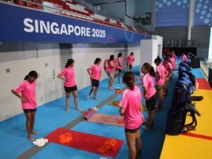 โดยทัพสาวไทยต้องใช้เวลาในการปรับตัวกับสภาพน้ำที่เย็นกว่าที่เคยฝึกซ้อมที่ไทย 1 ชั่วโมง จากนั้นก็เริ่มการซ้อมในรูปแบบการเล่น ซึ่งก็ซ้อมได้ไม่เต็มที่ เนื่องจากเจ้าภาพสิงคโปร์ ที่มีคิวซ้อมต่อจากไทย ได้เข้ามาก่อนเวลา และได้นั่งดูการซ้อมของไทยในช่วงก่อนหมดเวลา อย่างไรก็ตามนักกีฬาสาวไทยก็ได้ปรับร่างกายพอสมควร รวมทั้งกายภาพร่างกายให้พร้อมกับการแข่งขันนัดแรกพบกับ มาเลเซีย ในวันที่ 19 มิ.ย.2568