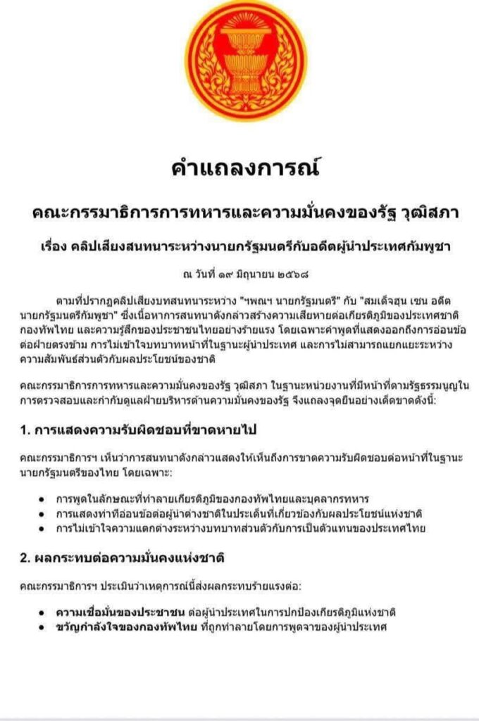 พลเอก สวัสดิ์ ทัศนาประธานคณะกรรมาธิการการทหารและความมั่นคงของวุฒิสภา ออกแถลงการณ์ถึงกรณีคลิปเสียงที่ถูกกล่าวหาว่า เป็นบทสนทนาระหว่างนายกรัฐมนตรี กับผู้นำประเทศกัมพูชา ซึ่งสร้างความเสียหายต่อเกียรติภูมิของประเทศ และความรู้สึกของประชาชนอย่างร้ายแรง