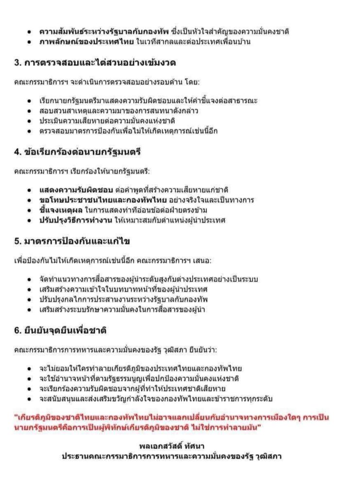 คณะกรรมาธิการฯ ได้เรียกร้องให้นายกรัฐมนตรีแสดงความรับผิดชอบอย่างตรงไปตรงมา และชี้แจงเหตุผลในการกระทำดังกล่าว พร้อมปรับปรุงวิธีการทำงานให้เหมาะสม กับตำแหน่งผู้นำประเทศ นอกจากนี้ ยังเน้นย้ำถึงความสำคัญของการปกป้องเกียรติภูมิของชาติและกองทัพไทย และจะไม่ยอมให้ใครมาทำลายชาติ ศาสนา พระมหากษัตริย์และกองทัพไทย พร้อมยืนยันสนับสนุนและส่งเสริมขวัญกำลังใจของกองทัพและข้าราชการทุกระดับ