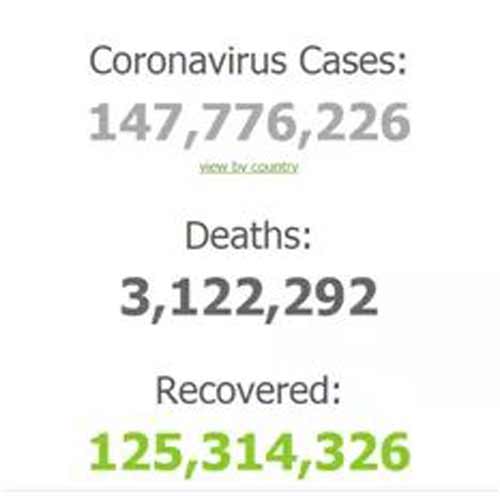 เว็บไซต์ Worldometers รายงานสถานการณ์โควิด-19 ประจำวันที่ 25 เมษายน 2564 ช่วงเวลาประมาณ 07.38 น. ตามเวลาในประเทศไทย พบ ผู้ติดเชื้อโควิด-19ทั่วโลก แล้ว 147,776,226ราย เสียชีวิต 3,122,292ราย รักษาหาย 125,314,326ราย