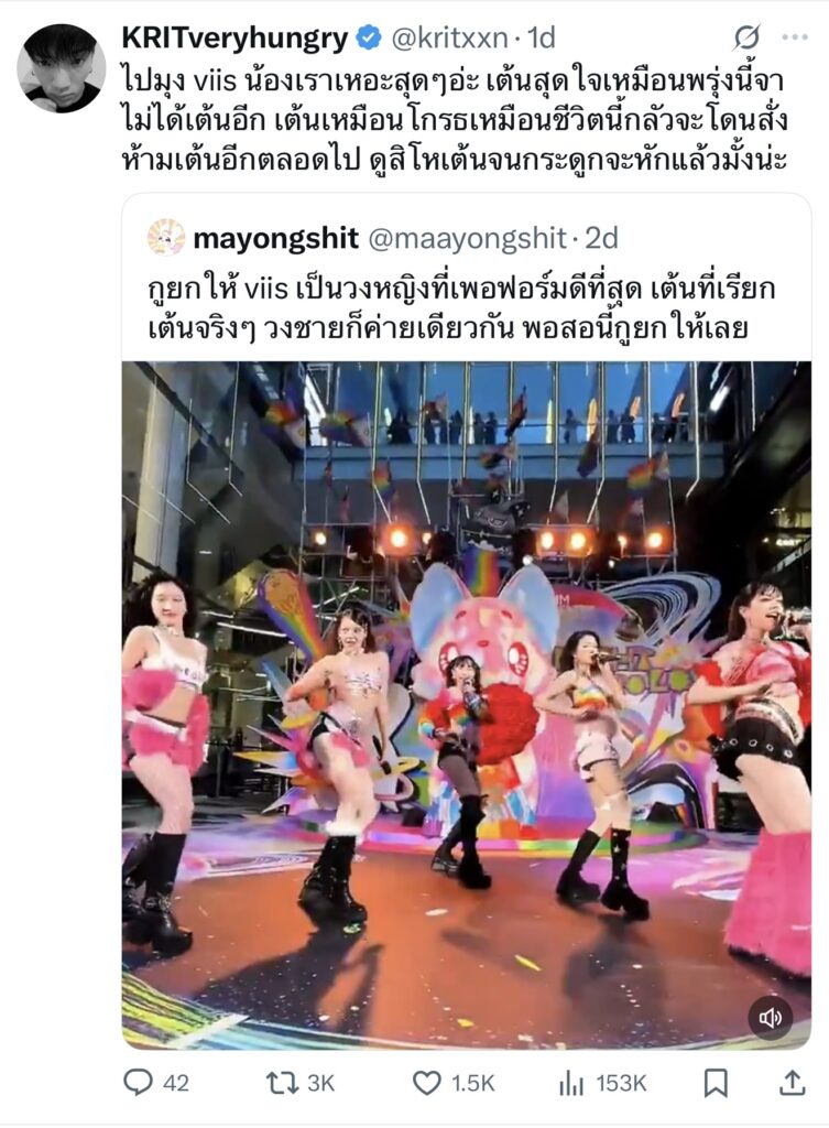 ไถไทม์ไลน์เจอ กฤติน PERSES แชร์คลิปโชว์ Performance เพลง จีบเอาสิคะ ของสาวๆวง VIIS (วิส) น้องสาวเกิร์ลกรุ๊ปร่วมค่าย G’NEST ที่หยิบเพลงของ ลำยอง หนองหินห่าว ศิลปินลูกทุ่งบ้าน แกรมมี่ โกลด์ มา Re-arrange ให้เป็นสไตล์ TPOP และครีเอทโชว์ใหม่ในแบบของวิส พร้อมแป่ะแคปชั่นขายน้อง “ไปมุง viis น้องเราเหอะสุดๆอ่ะ เต้นสุดใจเหมือนพรุ่งนี้จาไม่ได้เต้นอีก เต้นเหมือนโกรธเหมือนชีวิตนี้กลัวจะโดนสั่งห้ามเต้นอีกตลอดไป ดูสิโหเต้นจนกระดูกจะหักแล้วมั้งน่ะ” นี่แหละคนที่ดันน้องสุดพลัง เอ็นดูพี่ชายกฤตินเค้านะคะ