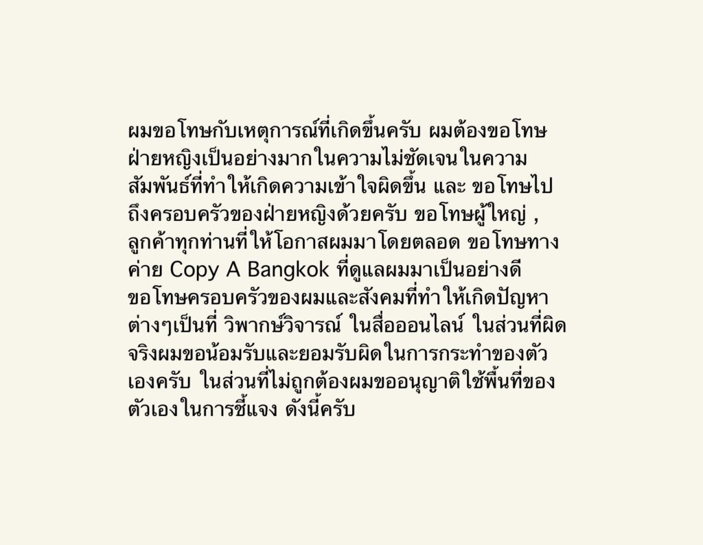 ล่าสุด “เชลล์” ได้ออกมาโพสต์ผ่าน X (Twitter) เปิดเผยถึงเรื่องราวทั้งหมดและโต้แย้งข้อกว่าวหาว่า “ผมขอโทษกับเหตุการณ์ที่เกิดขึ้นครับ ผมต้องขอโทษฝ่ายหญิงเป็นอย่างมากในความไม่ชัดเจนในความสัมพันธ์ที่ทำให้เกิดความเข้าใจผิดขึ้น และ ขอโทษไปถึงครอบครัวของฝ่ายหญิงด้วยครับ ขอโทษผู้ใหญ่ ,ลูกค้าทุกท่านที่ให้โอกาสผมมาโดยตลอดขอโทษทางค่าย Copy A Bangkok ที่ดูแลผมมาเป็นอย่างดี ขอโทษครอบครัวของผมและสังคมที่ทำให้เกิดปัญหาต่างๆ เป็นที่วิพากษ์วิจารณ์ ในสื่อออนไลน์ ในส่วนที่ผิดจริงผมขอน้อมรับและยอมรับผิดในการกระทำของตัวเองครับ ในส่วนที่ไม่ถูกต้องผมขออนุญาตใช้พื้นที่ของตัวเองในการชี้แจง ดังนี้ครับ