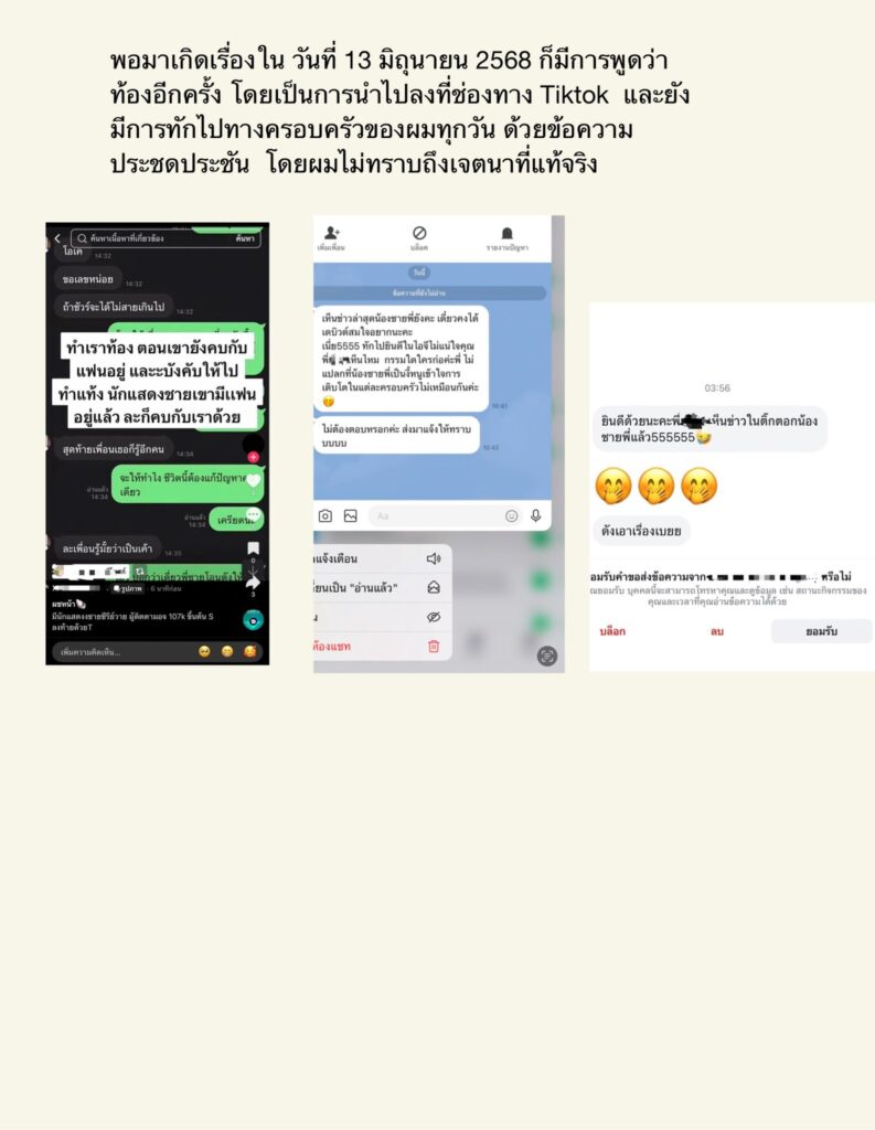 พอมาเกิดเรื่องใน วันที่ 13 มิถุนายน 2568 ก็มีการพูดว่าท้องอีกครั้ง โดยเป็นการนำไปลงที่ช่องทาง TikTok และยังมีการทักไปทางครอบครัวของผมทุกวัน ด้วยข้อความประชดประชัน โดยผมไม่ทราบถึงเจตนาที่แท้จริง