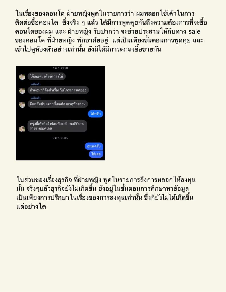 ในเรื่องของคอนโด ฝ่ายหญิงพูดในรายการว่า ผมหลอกใช้เค้าในการติดต่อซื้อคอนโด ซึ่งจริง ๆ แล้ว ได้มีการพูดคุยกันถึงความต้องการที่จะซื้อคอนโดของผม และ ฝ่ายหญิง รับปากว่า จะช่วยประสานให้กับทาง saleของคอนโด ที่ฝ่ายหญิง พักอาศัยอยู่ แต่เป็นเพียงขั้นตอนการพูดคุย และเข้าไปดูห้องตัวอย่างเท่านั้น ยังมิได้มีการตกลงชื่อขายกัน