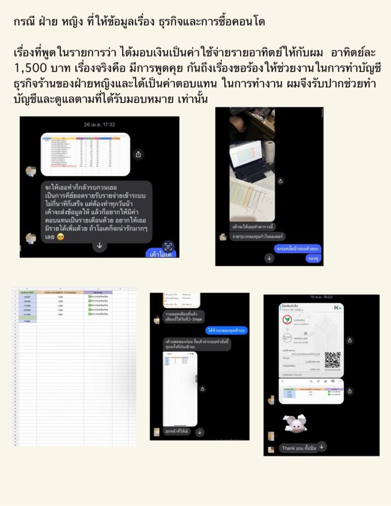 กรณี ฝ่าย หญิง ที่ให้ข้อมูลเรื่อง ธุรกิจและการซื้อคอนโด เรื่องที่พูดในรายการว่า ได้มอบเงินเป็นค่าใช้จ่ายรายอาทิตย์ให้กับผม อาทิตย์ละ 1,500 บาท เรื่องจริงคือ มีการพูดคุย กันถึงเรื่องขอร้องให้ช่วยงานในการทำบัญชีธุรกิจร้านของฝ่ายหญิงและได้เป็นค่าตอบแทน ในการทำงาน ผมจึงรับปากช่วยทำบัญชีและดูแลตามที่ได้รับมอบหมายเท่านั้น