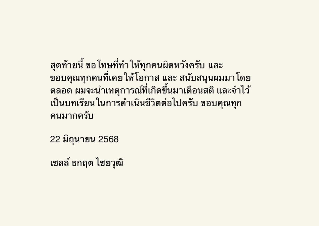 สุดท้ายนี้ ขอโทษที่ทำให้ทุกคนผิดหวังครับ และขอบคุณทุกคนที่เคยให้โอกาส และ สนับสนุนผมมาโดยตลอด ผมจะนำเหตุการณ์ที่เกิดขึ้นมาเตือนสติ และจำไว้เป็นบทเรียนในการดำเนินชีวิตต่อไปครับ ขอบคุณทุกคนมากครับ”