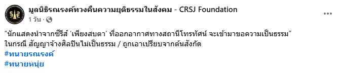 ต้องบอกเลยว่าช่วงนี้วงการซีรีส์วายมีเรื่องให้ใส่ใจไม่พัก ซึ่งนาทีนี้เป็นเรื่องราวของกลุ่มนักแสดงที่โดนผู้จัดการบริษัทโกงค่าตัวโดยทางเพจ “มูลนิธิรณรงค์ทวงคืนความยุติธรรมในสังคม – CRSJ Foundation” ได้โพสต์ว่า ““นักแสดงนำจากซีรีส์ ‘เพียงสบตา’ ที่ออกอากาศทางสถานีโทรทัศน์ จะเข้ามาขอความเป็นธรรม”ในกรณี สัญญาจ้างศิลปินไม่เป็นธรรม / ถูกเอาเปรียบจากต้นสังกัด #ทนายรณรงค์ #ทนายหนุ่ย”
