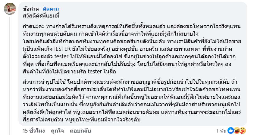 โดยปกติแล้วสิ่งที่ก้าดบอกทีมงานทุกคนคือขออธิบายดังนี้นะคับ ทางเรามีสินค้าที่ยังไม่ได้เปิดขาย (เป็นแพ็คเก็จTESTER ยังไม่ใช่ของจริง) อย่างคุชชั่น อายครีม และอายพาเลทตา ที่ทีมงานก้าดตั้งใจจะส่งตัว tester ไปให้พี่แอมมี่ได้ลองใช้ ซึ่งอยู่ในช่วงให้ลูกค้าและทุกๆคนได้ลองใช้ได้มากที่สุด เพื่อเก็บฟีดแบคเรียลๆและนำกลับไปปรับปรุง โดยไม่ได้มีเจตนาให้ลูกค้าหรือใครใดๆ ลงสินค้าในที่ยังไม่เปิดขายหรือ tester ในสื่อ