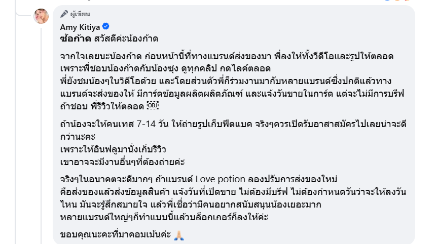 ถ้าน้องจะให้คนเทส 7-14 วัน ให้ถ่ายรูปเก็บฟีตแบค จริงๆควรเปิดรับอาสาสมัครไปเลยน่าจะดีกว่านะคะ เพราะให้อินฟลูมานั่งเก็บรีวิว เขาอาจจะมีงานอื่นๆที่ต้องถ่ายค่ะ จริงๆในอนาคตจะดีมากๆ ถ้าแบรนด์ Love potion ลองปรับการส่งของใหม่ คือส่งของแล้วส่งข้อมูลสินค้า แจ้งวันที่เปิดขาย ไม่ต้องมีบรีฟ ไม่ต้องกำหนดวันว่าจะให้ลงวันไหน มันจะรู้สึกสบายใจ แล้วพี่เชื่อว่ามีคนอยากสนับสนุนน้องเยอะมาก หลายแบรนด์ใหญ่ๆก็ทำแบบนี้แล้วบล็อกเกอร์ก็ลงให้ค่ะ ขอบคุณนะคะที่มาคอมเม้นค่ะ ”