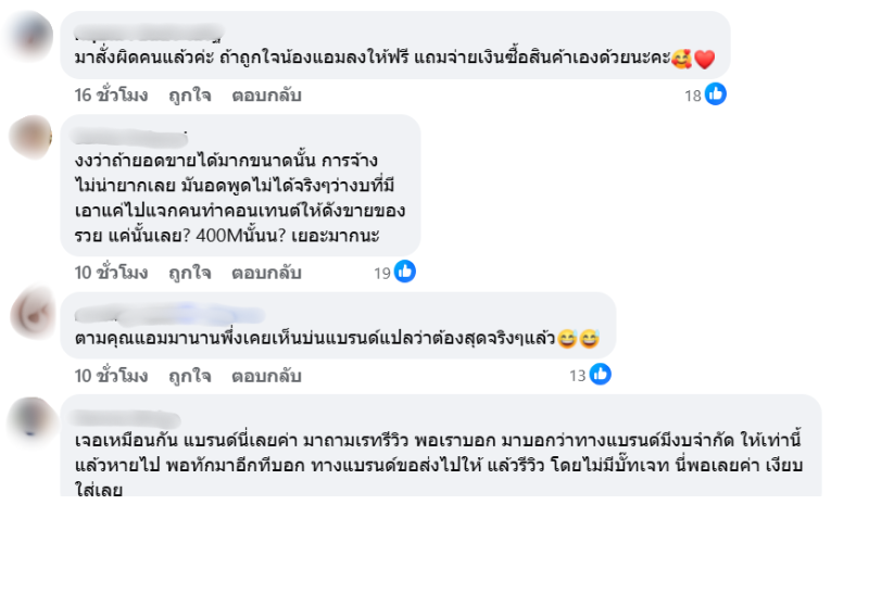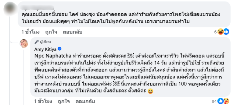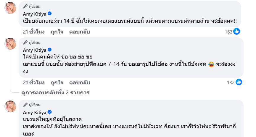 เพียงไม่นานก็มีแฟนคลับเข้ามาคอมเมนต์มากมาย ซึ่งทางด้าน “แอมมี่” ก็ได้โพสต์เพิ่มเติมว่า “บล็อกเกอร์คนอื่นถามว่าแบรนด์ไหน พอบอกหลังไมค์ไปคนอื่นโดนเหมือนกัน บรีฟเน้น บอกให้ลงวันไหน แต่ไม่มีบัจเจท แล้วขอเอารุปไปใช้ด้วย โหวววว แบรนด์ L …. เราลงให้ฟรีตลอดแต่บางทีก็เกินไปปป แบรนด์อื่นส่งของให้ เราลงให้เอง ถ้าเราชอบ แต่ไม่ใช่บรีฟแน่น ต้องฟีตแบค ให้ถ่ายรุป 7-14 วัน แล้วเอารุปไปใช้อีก คุณขาาาา ขายของหลายร้อยล้าน นี่ดิฉันเป็นบล็อกเกอร์มา 14 ปี พึ่งเคยเจอแบบนี้… ”