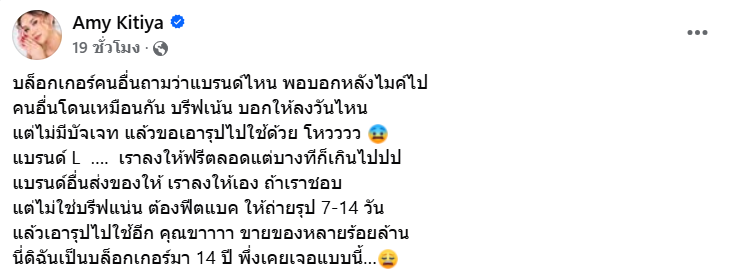 เรียกได้ว่าวงการอินฟลูเอนเซอร์สายเครื่องสำอางค์ถึงกับเดือดเมื่อสาว “แอมมี่ กิตติยา” ได้ออกมาโพสต์ระบายความในใจถึงแบรนด์เครื่องสำอางค์แบรนด์หนึ่งว่า “ไม่มีบัจเจท แต่มีบรีฟให้ถ่ายเก็บผลด้วย ให้ฟีตแบค จะนำรูปไปใช้อีก บางทีก็เกินไปปปป!!! ก่อนหน้านี้ลงให้ตลอด อย่าเอาความใจดีมาเอาเปรียบสิไม่แฟร์เลย” และได้คอมเมนต์ใต้โพสต์นี้อีกว่า “เป็นบล้อกเกอร์มา 14 ปี ฉันไม่เคยเจอเลยแบรนด์แบบนี้ แล้วคนตามแบรนด์หลายล้าน จะช้อคคค!! ใครเป็นคนคิดให้ ขอ ขอ ขอ ขอ เอาแบบนี้ แบบนั้น ต้องถ่ายรุปฟีตแบค 7-14 วัน ขอเอารุปไปใช้ต่อ งานนี้ไม่มีบัจเจท จะร้องงงงง แบรนด์ใหญ่ๆที่อยุ่ในตลาด เขาส่งของให้ ยังไม่บรีฟหนักขนาดนี้เลย บางแบรนด์ไม่มีบัจเจท ก็ส่งมา เราก็รีวิวให้นะ รีวิวฟรีมาก็เยอะ แต่เจอแบรนด์นี้คือช้อคคค!”