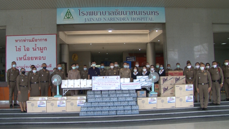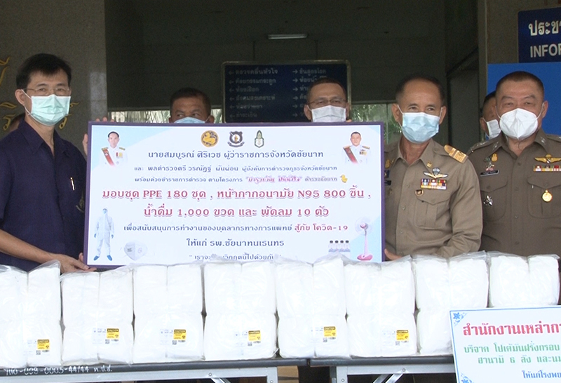 นายสมบูรณ์ ศิริเวช ผู้ว่าราชการจังหวัดชัยนาท พร้อมด้วย พต.ต.ต.วรณัฎฐ์ ผันผ่อง ผู้บังคับการตำรวจภูธรจังหวัดชัยนาท, นางจุฬาภร ศิริเวช นายกเหล่ากาชาดจังหวัดชัยนาท ข้าราชการตำรวจจังหวัดชัยนาท และหน่วยงานที่เกี่ยวข้อง ร่วมกัน มอบชุด PPE จำนวน 180 ชุด หน้ากากอนามัย N95 จำนวน 800 ชิ้น น้ำดื่ม 1,000 ขวด และอุปกรณ์ทางการแพทย์อื่นๆ ให้กับ นพ.พรเพชร นันทวุฒิพันธุ์ ผู้อำนวยการโรงพยาบาลชัยนาทนเรนทร ตามโครงการบำรุงขวัญ ปันน้ำใจ ตำรวจชัยนาท เพื่อสนับสนุนในภารกิจการปฏิบัติหน้าที่ป้องกันและรักษา ผู้ป่วยติดเชื้อไวรัสโควิด-19 ในพื้นที่จังหวัดชัยนาท