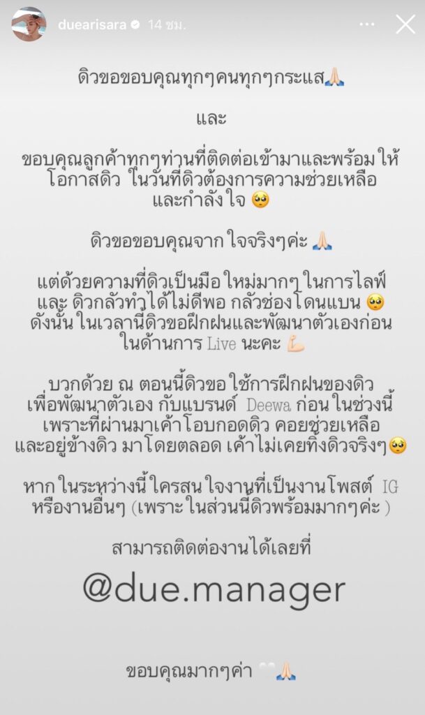 ล่าสุดทางด้าน “ดิว อริสรา” ก็ออกมาโพสต์ในไอจีสตอรี่ว่า “ดิวขอขอบคุณทุกๆ คน ทุกๆ กระแส และขอบคุณลูกค้าทุกๆ ท่านที่ติดต่อเข้ามาและพร้อมให้โอกาสดิว ในวันที่ดิวต้องการความช่วยเหลือและกำลังใจ
