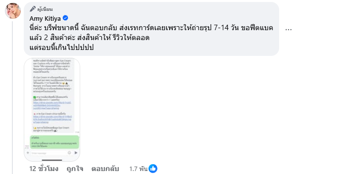 ทางด้าน “แอมมี่” จึงได้เปิดเผยถึงรายละเอียดรวมถึงข้อมูลบทสนทนาว่า “นี่ค่ะ บรีฟขนาดนี้ ฉันตอบกลับ ส่งเรทการ์ดเลยเพราะให้ถ่ายรุป 7-14 วัน ขอฟีตแบคแล้ว 2 สินค้าค่ะ ส่งสินค้าให้ รีวิวให้ตลอด แต่รอบนี้เกินไปปปปป”