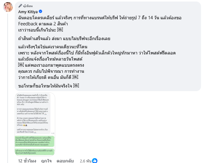 “ฉันตอบโคตรเคลียร์ แล้วจริงๆ การที่ทางแบรนด์ให้บรีฟ ให้ถ่ายรูป 7 ถึง 14 วัน แล้วต้องขอ Feedback ตามผล 2 สินค้าเราว่ารอบนี้เกินไปนะ ถ้าสินค้าเสร็จแล้ว ส่งมา แบบไม่บรีฟจะอีกเรื่องเลย แล้วจริงๆไม่ใช่แค่เราคนเดียวนะที่โดนเพราะ หลังจากโพสต์เรื่องนี้ไป ก็มีทั้งอินฟูตัวเล็กตัวใหญ่ทักมาหา ว่าให้โพสต์ฟรีตลอดแล้วยังแจ้งเรื่องไทม์หลายวันโพสต์ แต่พอเราออกมาพูดแบบตรงตรงคุณควรกลับไปพิจารณา การทำงานว่าการให้เกียรติ คนอื่น มันก็ดี  ขอโทษก็ขอโทษให้มันจริงใจ”