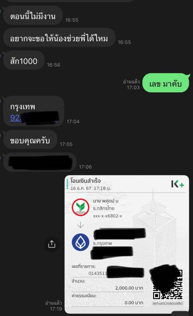 ดูวันที่เอาเองครั้งแรกมายืมเงินผมตั้งแต่ 16 ธค 67 คับ …. พี่เค้าเคยส่งมายืมผม 1000 บาท ดูเวลาเองว่าส่งมากี่โมงไม่เกิน 15 นาที ผมโอนให้ 2000 บาท …. ย้ำนะ ยืม 1000 ผมโอนให้ 2000 บาท ….และ หลังจากนั้น เริ่มยืมผมเยอะขึ้น ผมก็ไม่ให้ เพราะ2000 บาทแรก ที่ผมให้ไปยังไม่คืนผมเลย …มีคนถามว่าเอาไลน์ ผมมาจากไหนเป็นพี่ที่รู้จักกันนี่แหละครับ เคลียร์ นะคับ”