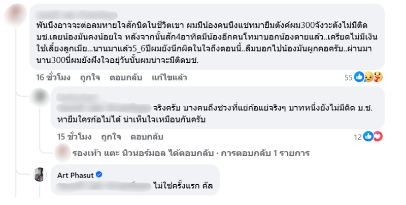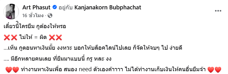 มีอีกหลายคนเลย ที่ยืมมาแบบนี้ กรู หละ งง ทำงานหาเงินเพื่อ สนอง need ตัวเองค้าาาา ไม่ได้ทำงานเก็บเงินให้คนอื่นยืมจ้า” หลังจากนั้นก็ได้มีชาวเน็ตเข้ามาคอมเมนต์ประมาณว่า “พันนึงอาจจะต่อลมหายใจสักนิดในชีวิตเขา” ทางด้าน “อาร์ต” จึงตอบกลับว่า “ไม่ใช่ครั้งแรกคับ”