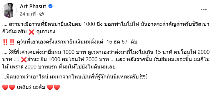 ซึ่งล่าสุด “อาร์ต” ก็ได้มาชี้แจงถึงเหตุผลที่ไม่ให้ยืมเงินโดยโพสต์รูปบทสนทนาครั้งแรกที่อีกฝ่ายทักมาขอยืมเงินซึ่งเจ้าตัวก็โอนให้ทันที ทั้งยังระบุเพิ่มเติมในแคปชั่นว่า “ดราม่าเมื่อวานที่มีคนมายืมเงินผม 1000 นึง บอกทำไมไม่ให้ มันอาตจะสำคัญสำหรับชีวิตเขาก็ได้นะครับ ดูเอาเอง