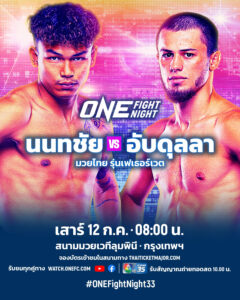 ร่วมด้วย “นนทชัย จิตรเมืองนนท์” นักชกดีกรีแชมป์ Road To ONE Thailand ซีซัน 2 วัย 26 ปี จากชุมพร พร้อมล่าชัย 4 ไฟต์รวด อาสารับน้อง “อับดุลลา ดายาคาเอฟ” จอมแสบจากรัสเซีย ที่จะขยับขึ้นมาชกในกติกามวยไทย รุ่นเฟเธอร์เวต (145-155 ป.) เป็นครั้งแรก