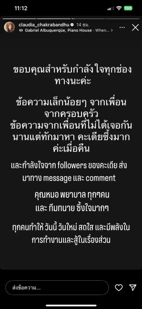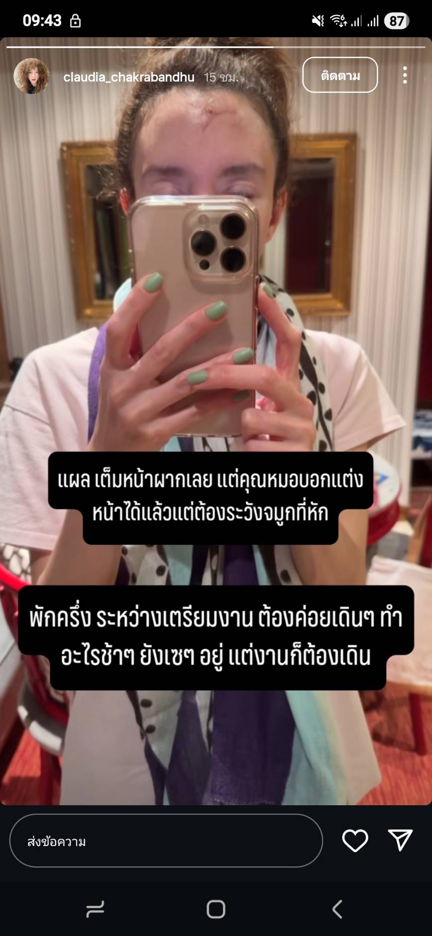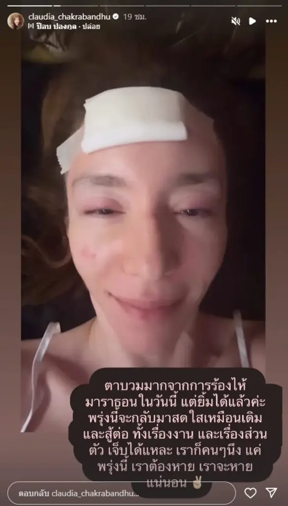 ล่าสุด “คลาวเดีย” ได้โพสต์สตอรี่เผยให้เห็นแผลบนหน้าผากที่ก่อนหน้านี้ปิดเอาไว้ และได้ระบุข้อความว่า “แผลเต็มหน้าผากเลย แต่คุณหมอบอกแต่งหน้าได้แล้วแต่ต้องระวังจมูกที่หัก พักครึ่งระหว่างเตรียมงาน ต้องค่อยเดิน ๆ ทำอะไรช้า ๆ ยังเซ ๆ อยู่ แต่งานก็ต้องเดิน”