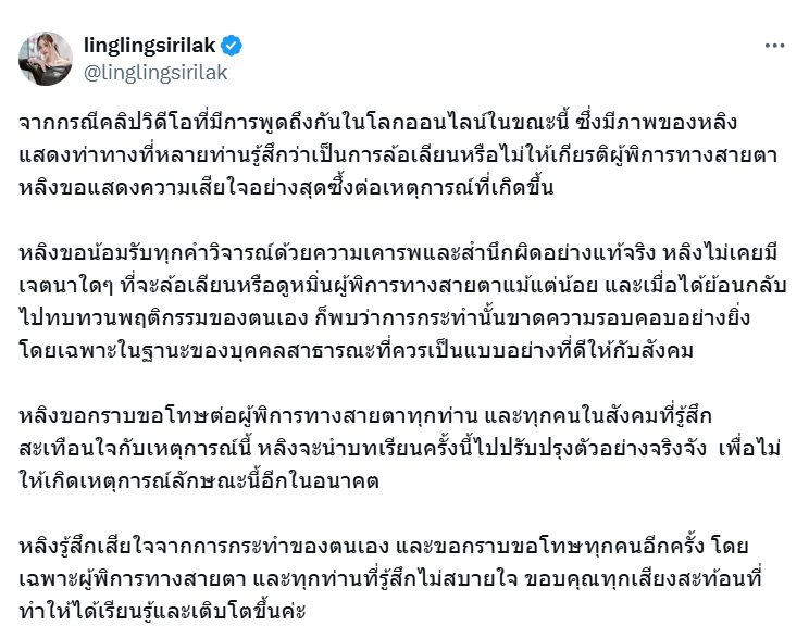 ล่าสุด “หลิงหลิง” จึงรีบออกมาโพสต์ขอโทษโดยระบุข้อความว่า “จากกรณีคลิปวิดีโอที่มีการพูดถึงกันในโลกออนไลน์ในขณะนี้ ซึ่งมีภาพของหลิงแสดงท่าทางที่หลายท่านรู้สึกว่าเป็นการล้อเลียนหรือไม่ให้เกียรติผู้พิการทางสายตา หลิงขอแสดงความเสียใจอย่างสุดซึ้งต่อเหตุการณ์ที่เกิดขึ้น หลิงขอน้อมรับทุกคำวิจารณ์ด้วยความเคารพและสำนึกผิดอย่างแท้จริง