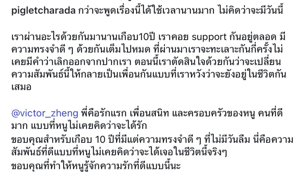 “กว่าจะพูดเรื่องนี้ได้ใช้เวลานานมาก ไม่คิดว่าจะมีวันนี้ ผ่านอะไรด้วยกันมานานเกือบ10ปี เราคอย support กันอยู่ตลอด มีความทรงจำดี ๆ ด้วยกันเต็มไปหมด ที่ผ่านมาเราจะทะเลาะกันกี่ครั้งไม่เคยมีคำว่าเลิกออกจากปากเรา ตอนนี้เราตัดสินใจด้วยกันว่าจะเปลี่ยนความสัมพันธ์นี้ให้กลายเป็นเพื่อนกันแบบที่เราหวังว่าจะยังอยู่ในชีวิตกันเสมอ พี่คือรักแรก เพื่อนสนิท และครอบครัวของหนู คนที่ดีมาก แบบที่หนูไม่เคยคิดว่าจะได้รักขอบคุณสำหรับเกือบ 10 ปีที่มีแต่ความทรงจำดี ๆ ที่ไม่มีวันลืม นี่คือความสัมพันธ์ที่ดีแบบที่หนูไม่เคยคิดว่าจะได้เจอในชีวิตนี้จริงๆขอบคุณที่ทำให้หนูรู้จักความรักที่ดีแบบนี้นะ”